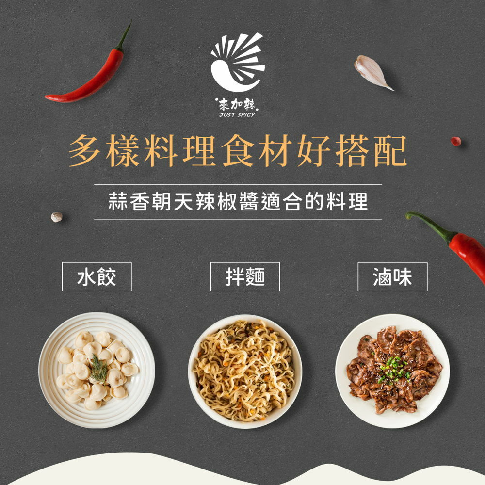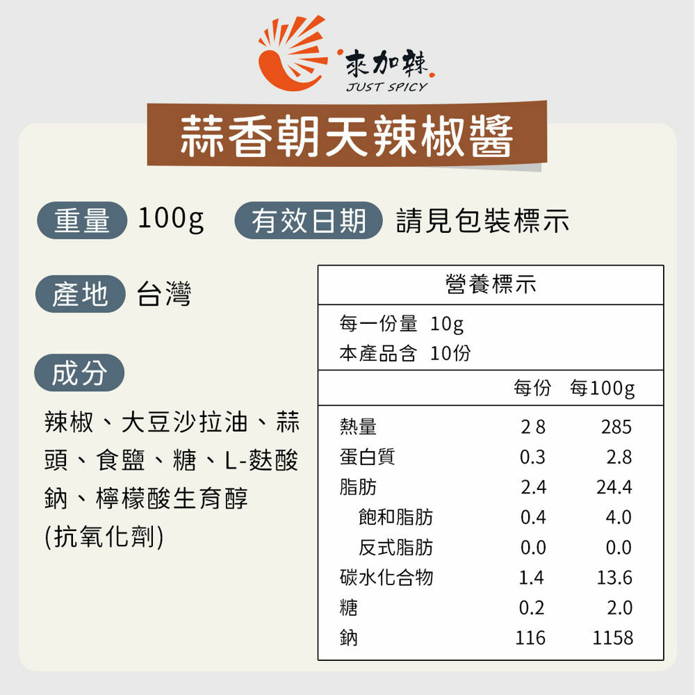 辣椒、大豆沙拉油、蒜頭、食鹽、糖、麩酸鈉、檸檬酸、混和濃縮 生育醇(抗氧化劑)