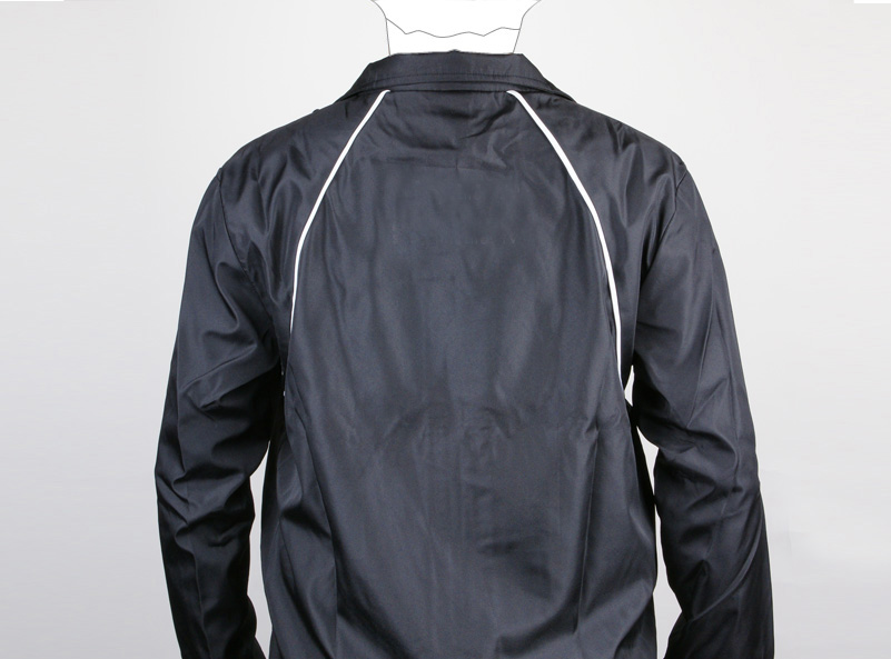 以酷黑色為基底,再由白色線條加以點綴,跳脫嚴肅的氣息。而表面為防風材質布料,於衣身下襬及兩袖口處皆有魔鬼氈束口設計,又於拉鍊處增加防風蓋片,是款實用性極高的風衣外套。