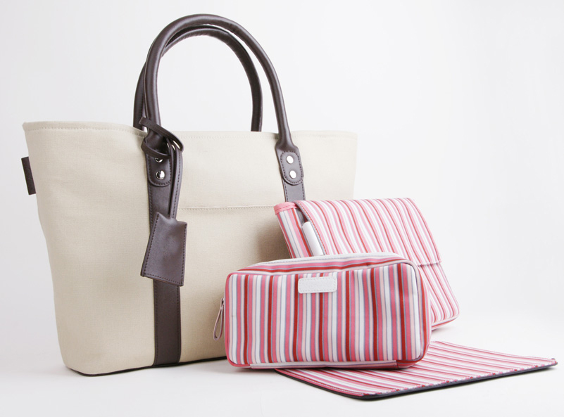 此款專為粉領族設計的側肩包,採用高盎司米色帆布與粉色系條紋布料做搭配,退去通勤生活裡中規中矩的氣息,帶來絕佳個性化的仕女風範。
