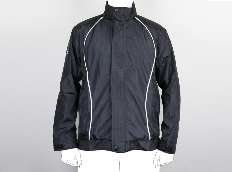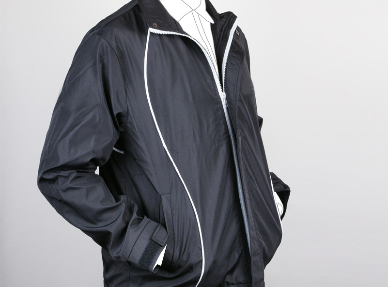 以酷黑色為基底,再由白色線條加以點綴,跳脫嚴肅的氣息。而表面為防風材質布料,於衣身下襬及兩袖口處皆有魔鬼氈束口設計,又於拉鍊處增加防風蓋片,是款實用性極高的風衣外套。