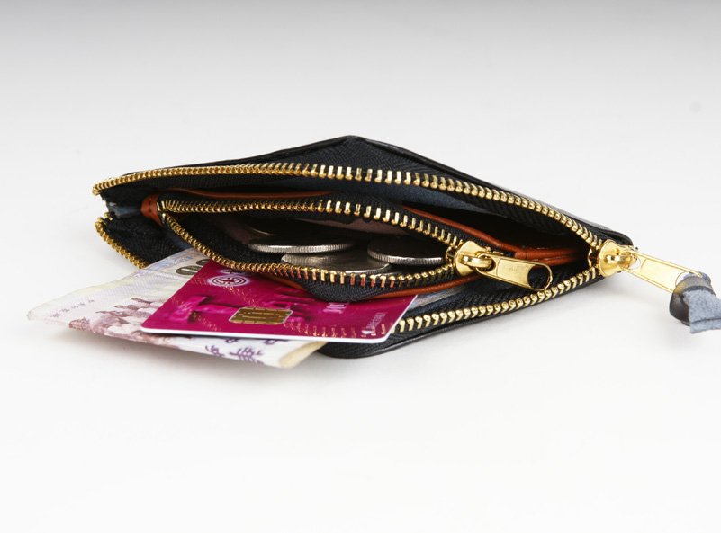 以牛皮製成,色澤溫潤,觸感柔軟的零錢包。提供雙夾層式設計,不論是零錢、鈔票及證件都可放置於此。