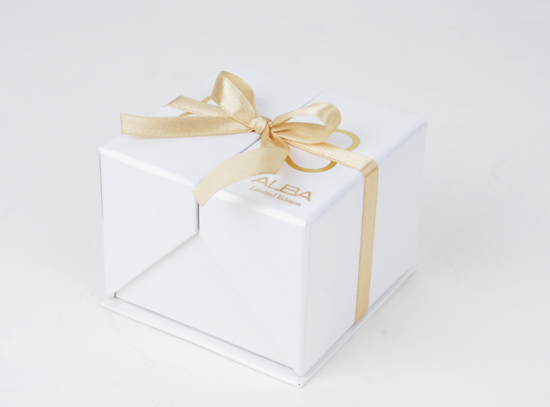 This watch box is made of pearl white glossy paper and golden ribbon. Sweet heart shapes are imprinted as a graceful decoration. And the way to open the box is just like opening a present that is surprising and romantic.